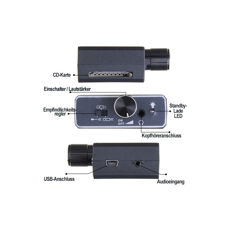 - Mikrofonverstärker bis zu 2000-Fach. Vier Abhörmodi einstellbar.